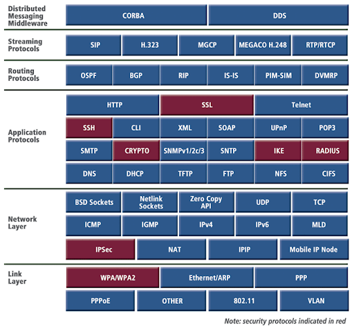 ومن ثم يمكن تنفيذ البروتوكولات على مستويات الأجهزة والبرامج والتطبيقات.