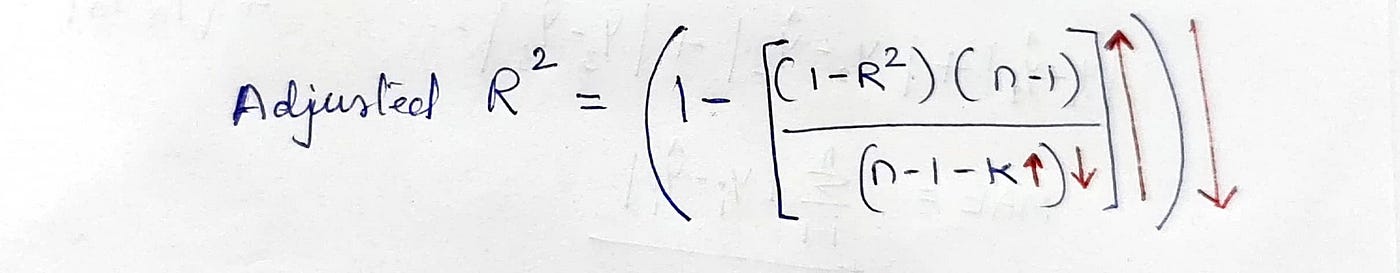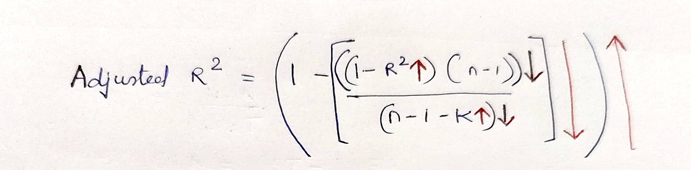 الحالة 1: إضافة عمود غير مهم عند إضافة عمود غير مهم بافتراض بقاء قيم R-Squared ثابتة حيث تنخفض قيم المقام (n-1-k ، تنخفض كلما زاد k) ويمكننا أن نرى في الشكل أدناه كيف تتأثر المصطلحات بإضافة متغيرات غير مهمة ومن ثم فإن قيمة التربيع R المعدلة تنخفض دائمًا عند إضافة متغيرات غير مهمة.