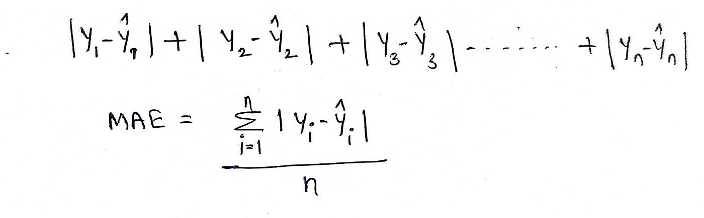 يقيس MAE متوسط حجم الأخطاء في مجموعة من التنبؤات دون النظر إلى اتجاهها، حيث يتم إعطاء الصيغة بواسطة،