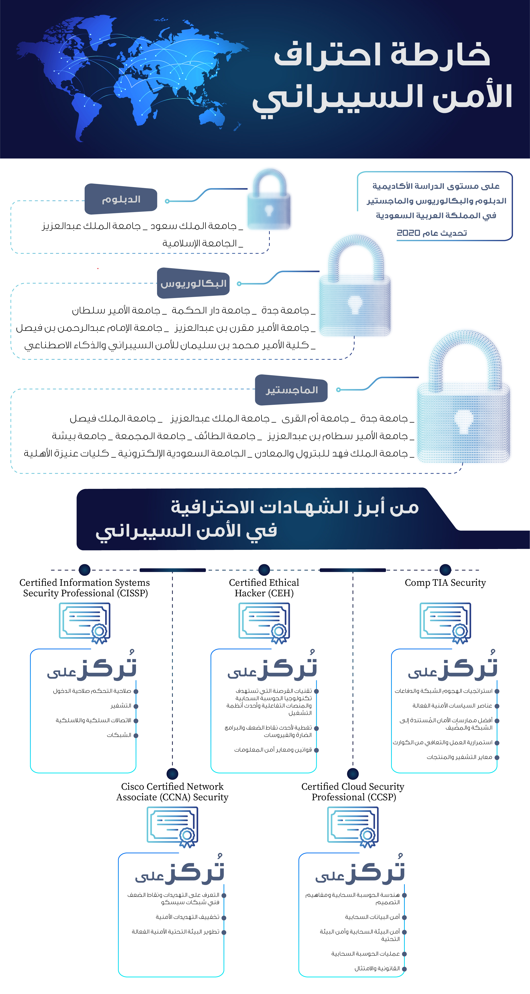 توضيح خطة لاحتراف الأمن السيبراني للمهتمّين أو من يرغب في دراسة مجال الأمن السيراني في المملكة العربية السعودية، وذكر أبرز الجامعات والشهادات بتحديث لعام 2020. عايض تركي الدوسري