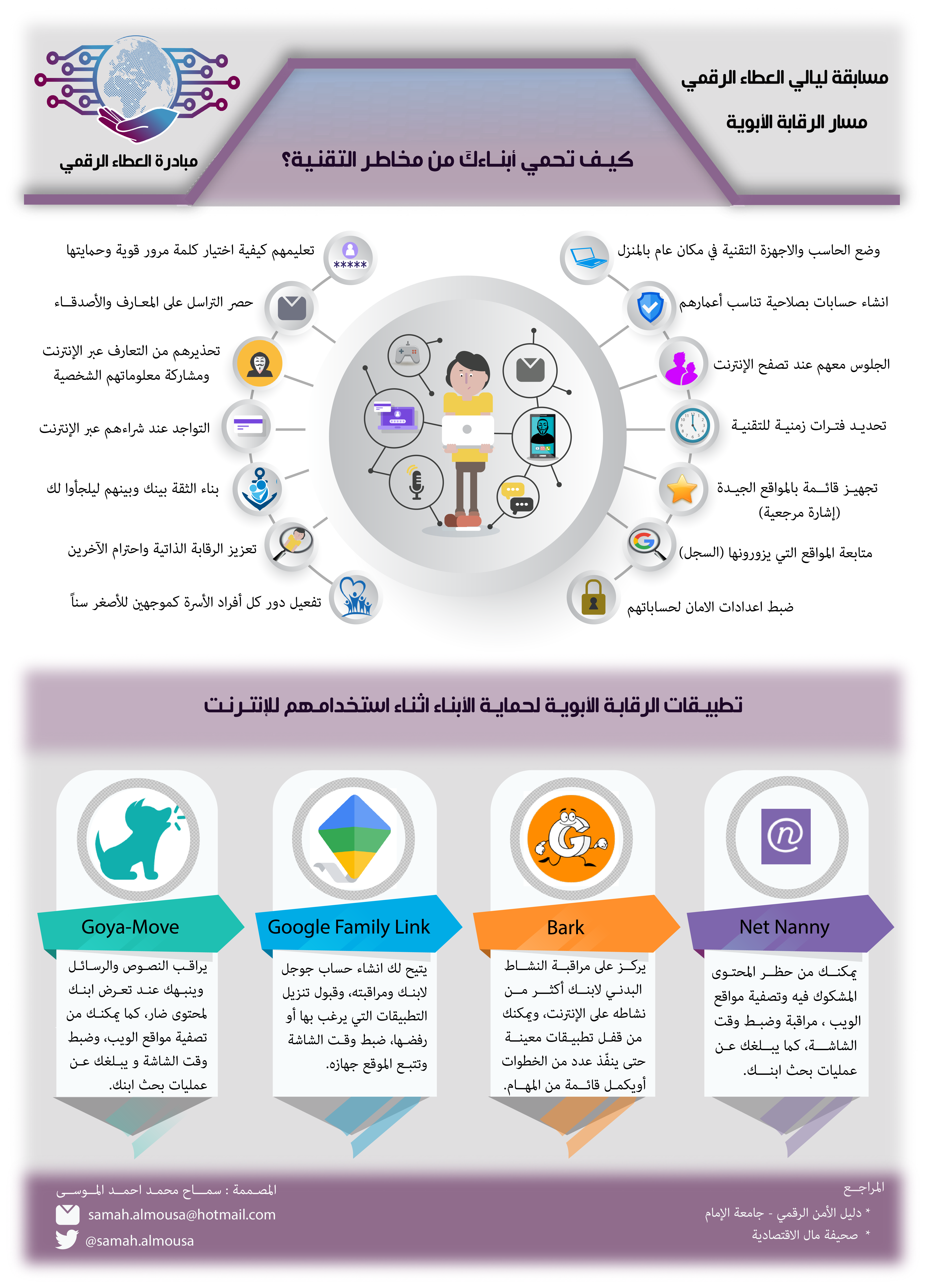 تصميم انفوجرافيك يتضمن نصائح وتطبيقات لحماية الأبناء من مخاطر التقنية . سماح محمد الموسى