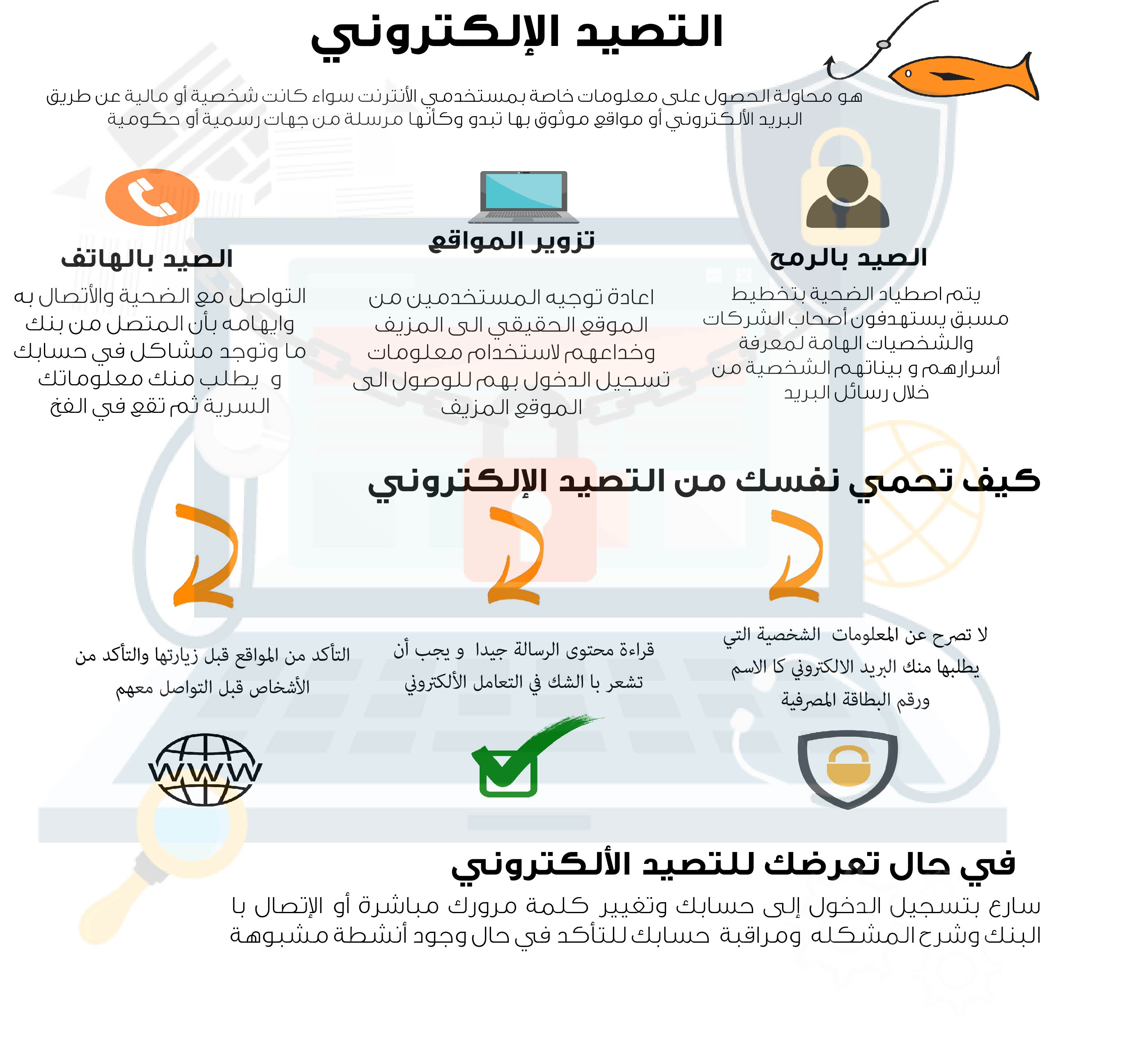 تصميم انفوجرافيك يهدف إلى زيادة وعي المستخدم العربي ضد أساليب التصيّد الإلكتروني؛ لأهميته في عصرنا الحالي الذي ازداد فيه الاحتيال على الناس بإرسال روابط ومواقع مزيّفة.